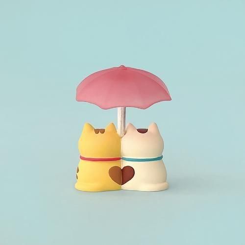 ひとつの傘でお散歩の仲良しにゃんこ。傘の下ではおしゃべりも弾みます。背中の模様にもご注目♪