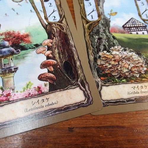 「森」に登場するキノコは《ナラタケ》や《アンズタケ》、《マイタケ》、《シイタケ》など10種類。プレイヤーは山札から公開された8枚のカードからなる「森」のカードを取って、高得点を目指します。